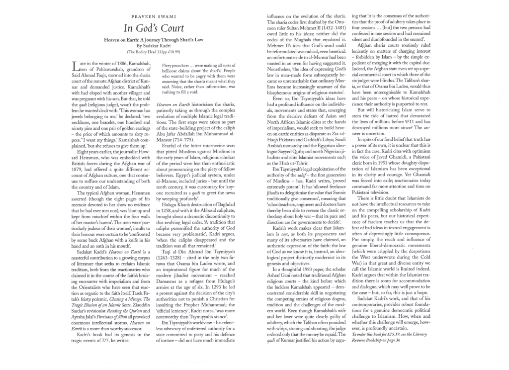 ‘Very few bother to find out just what the fuss [concerning shari’a] is all about . . . But if you do want to know more, read Sadakat Kadri. Peppered with humour and tales of wisdom, Heaven on Earth is a scholarly carpet that helps one have a bird’s-eye view of all the historic debates that have accompanied sharia’s entry into the modern world’ – Praveen Thampi, Economic Times (India)